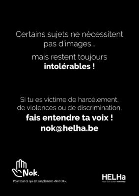 Parce que ce n’est pas OK, un point c’est tout, la HELHa lance NOK., un dispositif qui permet à un·e étudiant·e ou un·e membre du personnel de la HELHa victime d’un comportement inapproprié de le signaler en toute sécurité, d’être écouté·e et accompagné·e et, si il ou elle le souhaite, d’engager une action interne ou externe.