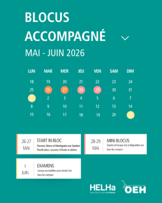 Blocus accompagné à la HELHa ! https://www.helha.be/blocus-accompagne-a-la-helha/ Thu, 16 Apr 2026 14:39:53 +0000 https://www.helha.be/?p=91697 À l’approche des examens, la HELHa met en place plusieurs dispositifs afin d’aider les étudiant·e·s à étudier dans les meilleures conditions.   À l’initiative du Service des Affaires Étudiantes (SAE) et en collaboration avec l’Organisation des Étudiant·e·s de la HELHa (OEH), cet accompagnement se décline en trois périodes-clés pendant le blocus et la session d’examens.     1. Start in Bloc | mardi 26 et mercredi 27 mai  La première période, intitulée « Start […]