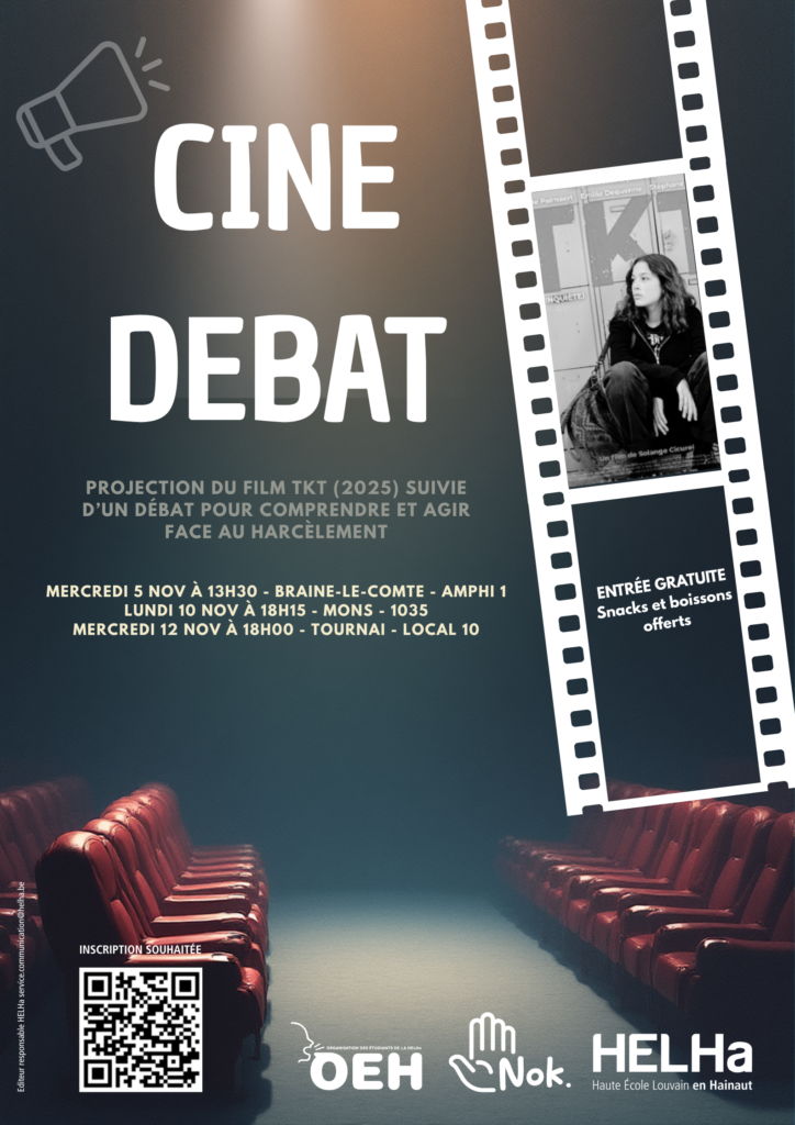 L’organisation des Etudiants de la HELHa (OEH) donne rendez-vous pour trois séances de ciné-débat autour du harcèlement, à travers la projection du film TKT, suivie d’un échange animé par des intervenant·e·s engagé·e·s et la présentation de la cellule NOK. de la HELHa, un dispositif d’écoute et de soutien pour les étudiant·es et membres du personnel confronté·e·s à des situations de harcèlement.
